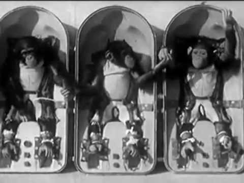 This monkey looks more serious about science and space travel then all the humans around him. Also note the gel drenched 50's hairstyles of the guys.